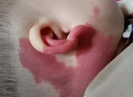 特征:出生即有,边缘不规则,颜色从粉红到深紫不等,常见于头面部、四肢。